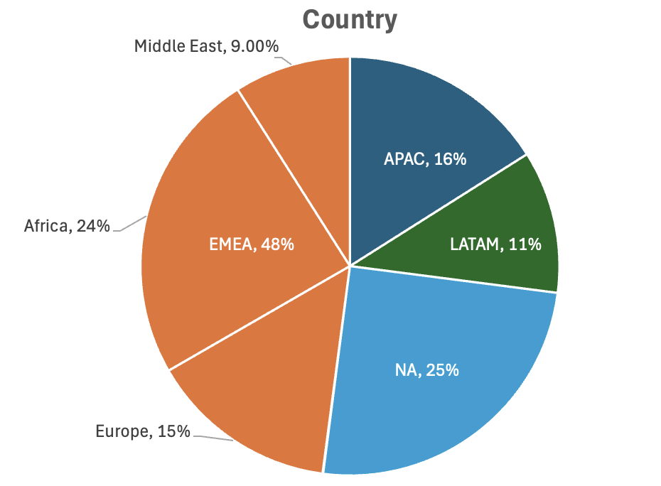 - Significant representation in Asia Pacific (16%) and Latin America (11%), covering diverse global development projects